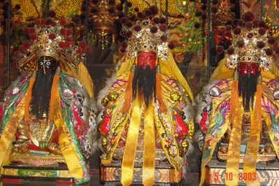 「三山國王」原為廣東省潮、惠、梅三州之鄉土神,亦為客家人移民的守護神,原本是潮州府揭陽縣霖田都河婆墟(今揭陽市揭西縣河婆鎮)西面的三座高山,即明山、巾山和獨山的鎮山神,三位一體,這是古人對名山靈石的自然崇拜。目前所裝扮的三山國王神像是擬人化的,是仿桃園三結義劉關張的,大王仿劉備是白臉,二王仿關公是紅臉,三王仿張飛是黑臉且加刀痕成花臉。大王也有黑臉是受香煙薰久的緣故。至於三山國王的姓氏和生平是後人尊崇而加進來,用來增加三山國王的民間信仰度。