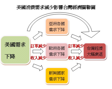 從美國消費衰退導致台灣經濟衰退關聯圖中可看出,美國的需求減少後,使主要出口到美國的國家,商品的出口開始銳減。然後,出口的減少使本國勞工的收入減少,連帶使這些國家的需求也開始下降。台灣經濟主要仰賴大量國際貿易的需求,當全球多數國家的需求開始下降後,台灣自然就無可避免的出現大幅的經濟衰退!