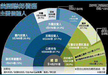 自2008年10月雷曼兄弟事件暴發以來,美債從10兆附近,跳上了14.3兆,成長40%以上。到了,2011年8月,又要調升2.4兆以上。依這個等比級數的速度下去,在2年內,美債的數字可能就會超過20兆美元。