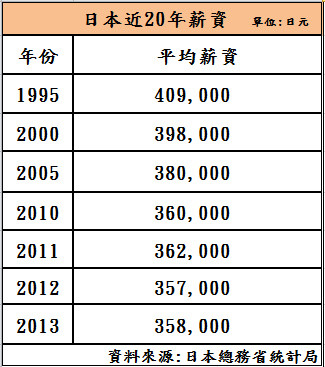 從下面表格(日本平均薪資表)可以看到,日本自1991年經濟泡沫後,民眾薪資開始逐年遞減,直至2015年仍未有往上調整的跡象。
